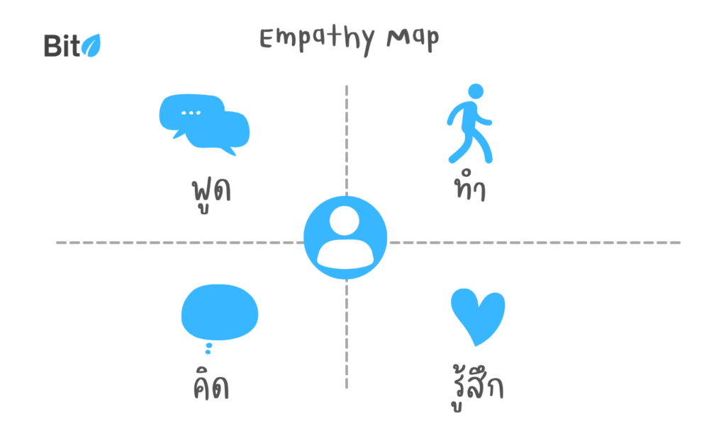 Empathy Map เป็นเครื่องมือที่ช่วยให้เราดึง Insign ของกลุ่มเป้าหมายผ่านการพูดและสิ่งที่เค้าแสดงออกสื่อถึงความคิดและความรู้สุกอย่างไร